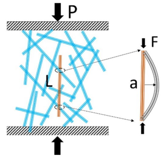 Even though Equation (4) describes the situation for a single fiber only, the fraction of load-carrying fibers that have not buckled for a given external stress is proportional to the mean single-fiber buckling force. Thus, the whole network strength can also be expected to depend on this load. Moreover, it is possible to develop an equation describing the stress increase as a function of the relative compression. For random fiber networks, the free-span length is exponentially distributed [27],