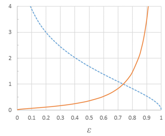 Universal functions (dashed blue curve) and (red curve) describing the relative changes in the critical free-span length and material stress for varied compressive strain . The same vertical axis describes the values of both functions.