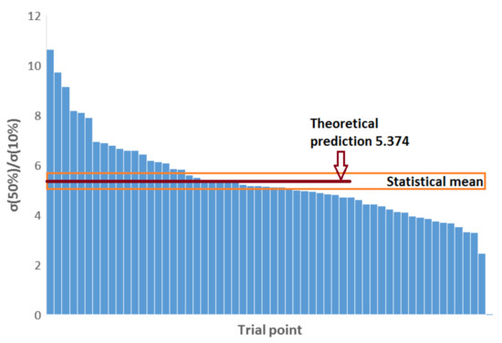 Distribution of the ratio over the 57 trial points of Table 1 with statistical mean compared to the universal theoretical prediction.