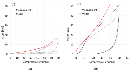 Cyclic compression test of (a) three replicates of V6 and (b) two replicates of V9 (only 50% cycle). The model (Equation (8), red curve) was fitted at 15% compressive strain to the test shown in black.