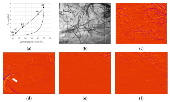 Compression test of the viscose sample V6. (a) Stress–strain curve for a 50% compression cycle. (b) Image of the network at 0% compression. Correlation plots showing dislocations of fibers from previous locations (shown in yellow color) to new adjacent locations (shown in dark purple color). (c) Dislocation activity in the network at low 5.6% compression. (d) Abrupt strong fiber dislocation at 17.9% compression; (e) The almost-still network at 41.8% compression. An almost identical correlation plot was also observed at 41.8% in release. (f) Dislocations concentrating on the upper region of the image at 49.6% compression. Imaging frequency: 10 Hz.