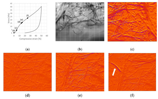 The behavior of a CTMP network along a 50% compression cycle is presented in Figure 6. The duration of the compression part is 27.3 s, and it is represented with 264 image frames. As the image acquisition was manually triggered, it was slightly delayed from the actual start of the compression. The sample was standing on a plate, and the camera was directed to its outer surface directly above the plate. Because of the very open porous structure, most of the imaged fibers were located inside the material rather than at the immediate outer surface. As an overview, the deformation appeared to be affine [14] and smooth, without major events. During compression of the fiber network, distinctive events of any type appeared at first to be rather rare by simple visual inspection. However, the volume of the region that was followed was rather small. The x−y window size was 6.7 mm × 5.4 mm, whereas in the depth direction, the focus length was clearly below 1 mm. For affine deformation, the vertical movement of a fiber segment in the upper part of this window within one frame was expected to be 0.5 × 5.4/264 mm = 10 µm, i.e., less than the fiber radius. Occasionally, a section of an individual fiber was abruptly dislocated much more within one frame (i.e., during 100 ms). Within the studied small region, eleven of such events were easily pinpointed at compression levels of 14.4%, 17.8%, 31.4%, 37.5%, 38.3%, 38.8%, 39.0%, 40.0%, 41.1%, 43.9%, and 44.1%. Typically one to four fibers participated in these events. Only at the very end of the cycle, e.g., at 39.4% and 47.3%, could significant bending or bulging of individual fibers be observed.