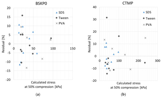 Residuals of fitted regression models at 50% compression for (a) BSKP0 and (b) CTMP for three different surfactants.