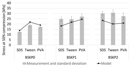 Figure 10 shows the stresses at the 50% compression level. Equation (9) predicts a square dependence of the stress on the initial density at any strain level. Motivated by this fact, we plotted stress against the initial density and fitted power curves to the results for each surfactant separately (Figure 10). All the data points appeared to follow their corresponding curves relatively closely. The density dependence was described with a power varying between 1.99 and 2.48 for the studied cases. The fact that the powers were rather close to 2 further supports the assumption that buckling is a dominant deformation mode underlying network strength, rather than fiber bending (corresponding to cubic dependence on density). The slight deviations from the square behavior could result from collective phenomena, such as distribution of bond properties that are not described by the idealized average model. The regression model predictions compared to the measured values are shown in Figure 11. The residuals were relatively random, confirming the good fit of the regression models. However, the predictions appeared to be somewhat poorer at low stress values.