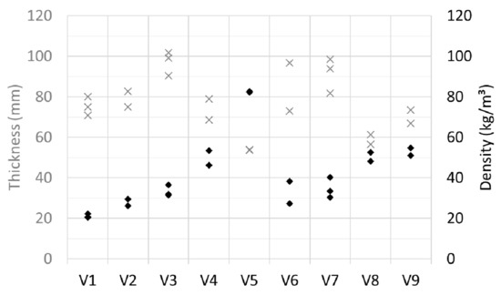 The preparation of the nonbonding viscose material did not aim at a predetermined density. Therefore, the sample densities ranged from 20 kg/m3 to 80 kg/m3 (see Figure 13). In certain conditions, such as a certain raw material consistency range, the air content of the batch can be independently chosen as an endpoint for the mixing (foaming). In higher consistencies, foaming does not occur unless additional energy is introduced to the stock, or mixing duration is increased. For viscose samples, the consistencies were an order of magnitude higher compared to the wood fiber samples. Samples V4, V5, V8, and V9 were relatively hard and not easily pliable to compression. The lightest samples were very open arrays of fibers, and the least bound samples, particularly samples V6 and V7, easily disintegrated during handling.