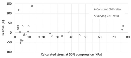 Residuals of fitted regression models at 50% compression for the viscose samples at constant and varying CNF ratios.