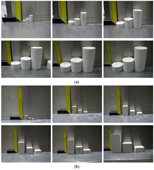 Tests included four series of masonry units with thickness within the range of 180–240 mm and different classes of density: 400, 500, 600, and 700, from each 20 masonry units were randomly selected. Six series of cores with varying diameters were taken from each masonry unit. Six series of square specimens having different side length and height were drilled from masonry units using a diamond saw. Cuboid specimens included blocks with dimensions of 100 mm × 100 mm × 100 mm, which were used as basic specimens for determining the strength fB (in accordance with Appendix B to the standard EN 771-4 [16]). Drilled core and cube specimens are illustrated in Figure 1. All specimens drilled from blocks were dried until constant weight at a temperature of 105 °C ± 5 °C (for at least 36 h).