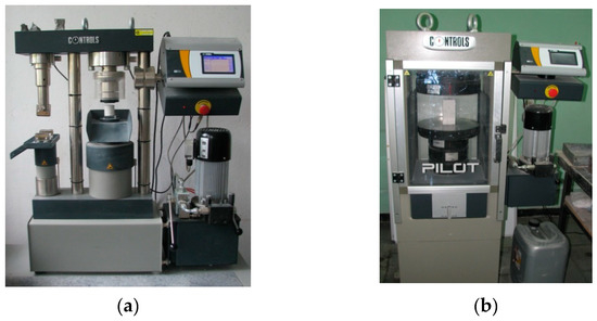 Testing compressive strength of AAC specimens [27]: (a) tests on cores using a strength testing machine with an operating range of 100 kN, and (b) tests on cuboid specimens using a strength testing machine with an operating range of 3000 kN.