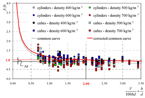When specimens 100 mm × 100 mm × 100 mm were used, the value of curve dominator was V/100hd + h/d = 2, and strength ratios calculated according to equations from Table 4 were fc/fB ≠ 1. To obtain the ratio fc/fB = 1 from normalized specimens, curves needed to be translated in parallel to the intercept axis using the additive correction factor Δb for the common curve: