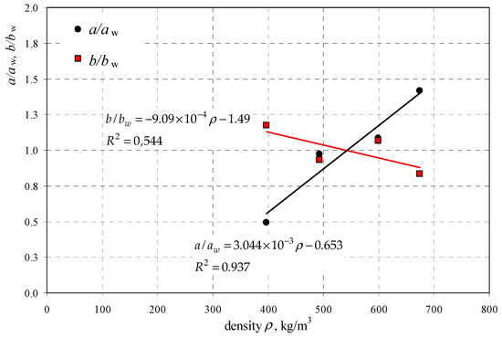Then, equations for individual curves were developed with reference to AAC density. Test results are presented in Table 7. The obtained coefficient values were compared to coefficients aw, bw, and cw for the common curve, and then plotted to the graph Figure 9b.