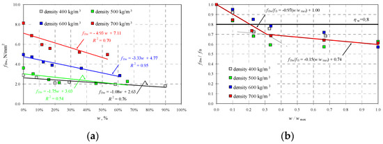 Test results for AAC strength, taking into account moisture level: (a) strength fBw as a function of moisture w, and (b) relative strength of AAC fBw/fB as a function w/wmax.