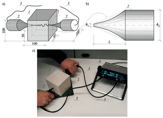 A test stand for measuring ultrasound velocity: (a) specimen geometry and elements of the stand (given in millimeters), (b) geometry of exponential transducer, and (c) a test stand; 1, tested AAC specimen 100 mm × 100 mm × 100 mm; 2, exponential transducers; 3, cables connecting transducers with recording equipment; 4, recording equipment; and 5, an insulating pad.