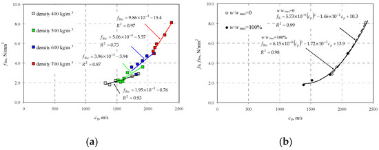 Performed tests showed that density and relative moisture affected the velocity of P-waves in AAC. By performing steps described in Section 2.2, at first the correlation curve was determined which presented ultrasound velocity in AAC specimens in air-dry conditions as a function of compressive strength fB. At the beginning, the curve representing the relationship between the average measured ultrasound velocity as a function of compressive strength fBw of wet AAC, grouping results by AAC density (Figure 8a). Higher sound velocity was found in concrete with greater density and compressive strength. Linear dependence, equations of which are illustrated in Figure 8a, are adequately precise approximations. Figure 8b illustrates results for compressive strength and corresponding ultrasound velocity of dry AAC (w/wmax = 0%), selected from each density class of AAC. Then, the relationship cp–fB was calculated with the least square method. For example, Figure 8b also shows the relationship of concrete with maximum moisture content (w/wmax = 100%), obtained similarly.