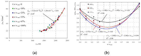 Results from ultrasound velocity testing: (a) common curve fBw–cp for all AAC densities and moisture levels, and (b) equations for curve coefficients at varying moisture content in AAC fBw.