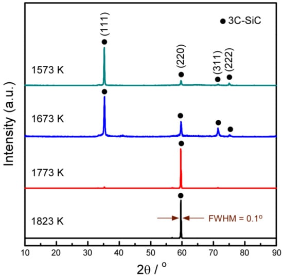 Graphite plates (20 × 20 × 5 mm) were used as substrates for the growth of SiC in a chamber of a vertical type hot-wall CVD. The details of the CVD apparatus can be found in our previous report []. The deposition temperature (Tdep) was 1573 to 1823 K. Tdep was calibrated by measuring the temperature near the top and bottom heating units by two W/Re thermocouples. An infrared thermometer (IR-AH, Chino, Tokyo, Japan), which focused on the surface of specimens, was set to monitor Tdep. The total pressure (Ptot) was controlled in the range of 1 to 40 kPa. The reactive gas featured a mixture of tetrachlorosilane (SiCl4, Aladdin industrial Co., Ltd, Shanghai, China, 99.50%), methane (CH4, Wuhan Xiangyun Chemical Industry Co., Ltd., 99.99%) were diluted in an H2 flow of 700 sccm (standard cubic centimeter per minute at standard temperature and pressure). The liquid SiCl4 was kept in a tank and conveyed via continuous bubbling methods with H2 as a carrier gas. The flow rates were tuned using a mass flow controller (MFC; D07-7, Sevenstar, Beijing, China). Before deposition, the graphite substrate was pretreated in dilution H2 flow of 2000 sccm for 5 min. The deposition time was 2 h. A cold trap surrounded by liquid nitrogen, a filter filled with activated carbon, and a NaOH spray scrubber were established to treat the exhaust gases.