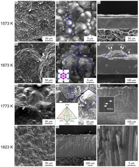 Figure 2 demonstrates the surface (Figure 2a,b) and cross-section (Figure 2c) morphology of SiC prepared at Tdep = 1573 K and Ptot = 4 kPa. Pyramid-like SiC grains with a hexagonal structure were obtained, which was ascribed to the six-fold symmetrical {111} planes of 3C-SiC. At Tdep = 1673 K (Figure 2d–f), the pyramid-like grains became larger. The change in the microstructure of the film at different temperatures depends on the orientation of the film. Pyramid-like grains with six-fold symmetry is the typical structure of <111>-oriented face-centered cubic crystal, producing the effect of the antiphase domain or twins, as shown as the inset in Figure 2e []. Figure 2 depicts the surface (Figure 2g,h) and cross-section (Figure 2i) morphology of 3C-SiC prepared at Tdep = 1773 K. The deposit is composed of many roof-like grains with five-fold symmetry. We found 100–200 μm-sized columnar grains perpendicular to the substrate in the cross-section of the film (Figure 2i) and twins were found in the inset. The {110} planes of SiC columnar grains were parallel to the substrate, growing continuously and forming a roof-like morphology. In recent research, we found that the {110} planes of SiC are caused by the twin-plane reentrant edge mechanism []. The inset in Figure 2h illustrates a schematic of the five-fold symmetry roof-like grains, formed by stacking twinned surfaces. With further increases in Tdep to 1823 K, the <110>-oriented film consisted of roof-like grains sized ~20 μm with about a nanoscale gap width at the grain boundaries (Figure 2j–l). A number of voids sized ~0.5 μm were found between the grain boundaries due to the excessive growth rate at high temperature [], which was not observed for other temperatures. The SEM observation corresponds to the XRD results (Figure 1), indicating the deposition temperature strongly affected the orientation of the deposits. Komiyama developed a model for predicting the preferred orientation in CVD processes by assuming Langmuir-type adsorption, including adsorption and reaction reactants [,,]. The model suggests that when the maximum rate of adsorption exceeds that of surface reaction, the growth rate is limited by surface reaction. In our case, though {110} planes have higher formation energy, higher deposition temperature had enough energy supply to form the corresponding planes. The decomposition rate of {111} planes exceeded the formation rate due to the excessive energy at higher deposition temperatures.