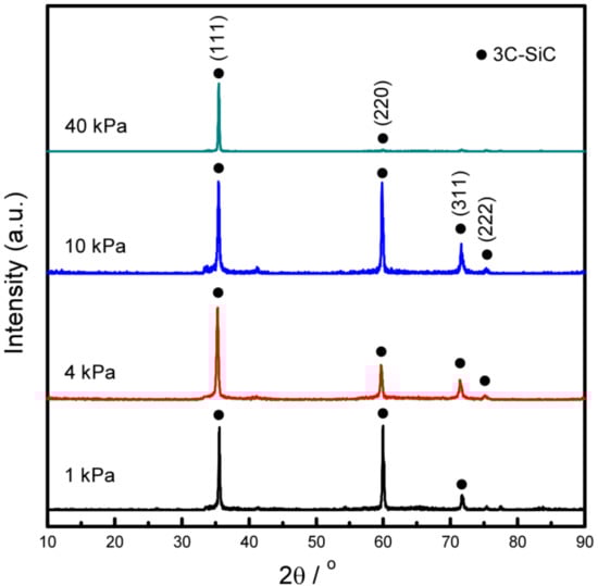 The XRD diffraction patterns of the SiC specimen deposited with various Ptot are shown in Figure 3. The presence of all sharp diffraction peaks suggests that the deposits were well-crystallized. With decreasing Ptot from 40 kPa to 1 kPa, <111> orientation transformed to <111>-<110> co-orientation.