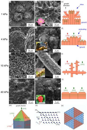 “Lotus in the ground” was exhibited in the surficial morphology at Tdep = 1673 K and Ptot = 1 kPa (Figure 4a,b). Both the lotus and the ground consisted of <111>-oriented columnar grain with a six-fold symmetry sharp tip, which is common in CVD 3C-SiC [,]. The nature of the <111>-oriented grain is shown in Figure 4m,o. Figure 4c displays the arrangement of the grains: the leading <111>-<110> co-orientation of the deposit. The angle between (111) and (110) planes is depicted in Figure 4n. Protruding in the ground were pyramids with six-fold symmetry, resembling a turtle shell, observed at Ptot = 4 kPa in Figure 4d,e. Figure 4f illustrates the structural details of the turtle shell. The hexagonal morphology of 3C-SiC (111) grains could be explained by TB analysis as shown in Figure 4o. At Ptot = 10 kPa, the deposit shows a thorn-like surficial morphology (Figure 4g). The schematic diagram of the arrangement is shown in Figure 4i. Thorn-like whiskers are the <111>-oriented columnar crystal with small <111>-oriented grains growing on the sides of “stem”. The whiskers were randomly arranged in the vertical and horizontal directions, so that the deposit also exhibited <111>-<110> co-orientation as shown as Figure 4i. At Ptot = 40 kPa, (Figure 4j,k), the relatively smoother surface of deposit shows a strawberry surface morphology that consisted of hexagons, which is the typical structure of <111>-orientation. Figure 4l is a schematic configuration diagram of the film growth at Ptot = 40 kPa. These SEM observations also correspond to the XRD results (Figure 3), indicating the morphology of the deposits strongly depended on Ptot. Generally, the amount of nucleus in the CVD growth process is controlled by the concentration of the precursors. In this work, increasing Ptot led lower reactant concentrations. At Ptot = 1 kPa, the high concentration of the reactant created multiple nucleus adsorption sites, leading to the dense structure of the deposit. With decreasing concentration at Ptot = 4 kPa, there was not enough reactant pieces to grow a large lotus, which “degenerated” to protruding. A thorn-like whisker structure formed at low concentrations with further decreasing of Ptot at 10 kPa []. Such whisker-like structures preferentially nucleate on crystal planes with high concentration of defects and then nucleate and grow in random directions. At Ptot = 40 kPa, the three-dimensional (3D) growth model transformed to the two-dimensional (2D) model caused by extremely low reactant concentration. The grains are preferentially grown in the surface direction that formed a dense structure again.