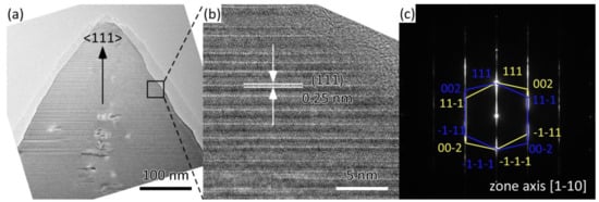 Figure 5 shows results of the transmission electron microscopy (TEM) analysis of the tip of an <111>-oriented columnar crystal in 3C-SiC sample B1 prepared at Tdep = 1673 K and Ptot = 1 kPa. Figure 5a shows the cross-sectional TEM bright-field (BF) images. A magnified area of the BF image of the tip is shown in Figure 5b. The lattice distance along the tip direction is approximately 0.25 nm, which is in agreement with the d-value of the 3C-SiC (111) plane. The Selected Area Electron Diffraction (SAED) (Figure 5c) was indexed as two sets (yellow and blue) of well-defined (111) twins, which are along the zone axes of [1–10] and [−110], respectively. The elongated spots imply a large amount of twins and stacking faults in the <111> direction.