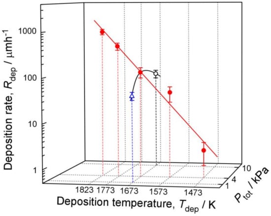 Figure 6 shows the dependence of the deposition rate on Tdep and Ptot. Rdep exponentially increases with increasing Tdep. Generally, the Rdep increases with the gas concentration of precursors; higher Rdep may also increase with Ptot. However, in this study, the maximum Rdep was obtained at Ptot = 4 kPa. For above than 4 kPa, the Rdep decreased due to the homogeneous reaction in the gas phase. In this study, the deposition rate changed with Ptot and showed a maximum Rdep of 731 μm−1 at Ptot = 4 kPa.
