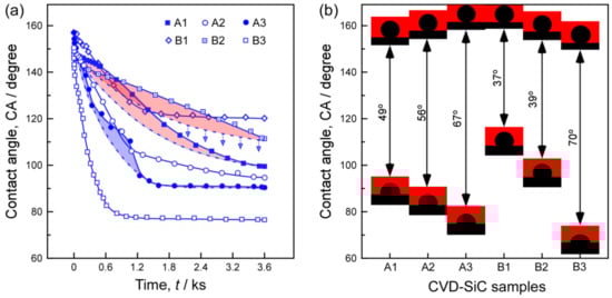 The wetting behaviors of the CVD-SiC samples were examined at 1173 K under a high vacuum (~3 × 10−4 Pa) atmosphere using the improved sessile drop method, where liquid aluminum (Al 99.99 wt %, typically with mass of 0.1 g) sessile drop was formed by an alumina tube and then dropped on the surface of SiC substrates. The testing furnace consisted of a tantalum cylindrical heating element with a Mo isolating shield, a thermocouple near the alumina tube for temperature monitoring, an evacuating system with a rotary pump, a turbo molecular pump for creating a strong vacuum, a He-Ne laser for illumination, and a high resolution charge coupled device (CCD) camera to collect high-definition drop profiles. The moment at which the liquid Al contacted the surface of SiC and formed a droplet was defined as the start of the wetting process (i.e., t = 0 s in the wetting curve). Subsequent photographs were captured at certain time intervals the total photographing time was 3.6 ks. A detailed description of the apparatus installation and procedure was previously published []. Finally, the contact angle (CA) was calculated using an axisymmetric drop shape analysis program based on the captured drop profiles. Figure 7a shows the wetting behavior of pure Al on the oriented SiC films with respect to wetting duration at a wetting temperature of 1173 K, and Figure 7b depicts the variations in initial (upper panel) and final (bottom panel) contact angles. The shaded area in Figure 7a indicates that the wetting behaviors are probably affected by the SiC anisotropic surface that hinders the wetting process (especially for samples A1, A2, and B2). As shown as Figure 7b, all samples exhibited larger initial contacted angles up to 160 degree. We must notice that sample B1 and B2 with coarse surface also exhibited final contact angles larger than 100 degree, whereas the final contact angles (3.6 ks) of SiC with smooth surface were about only 60 degree in previous reports [,]. Sample B1, with a lotus-like surface morphology, had the largest contact angle both at the initial and final times. Sample B1 should be adequate for application in high temperature furnaces in the semiconductor industry.