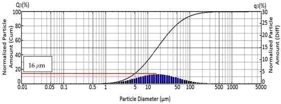 Figure 2 illustrates the particle size analysis of the Gr powder. The result reveals a normal distribution with an average size of powder particles of 16 µm. In previous studies, Li et al. [18] used Gr particles with 12 µm, and Tian et al. [15] used 20 µm Gr particles where Li et al. [18] reported that the size of the Gr particles affects the resistivity of the MRE. Therefore, in this study, the size of Gr used was 16 µm, which is in the range of the particle size used by previous researchers. Figure 3 displays the microstructure of the Gr-MRE sample. The figure shows that the CIP particles were randomly distributed in the rubber matrix, whereas the Gr particles were distributed randomly between the CIP particles albeit in different orientations as a result of its natural nonlinear shapes and sizes. Figure 3 also shows that the Gr-MRE mix appeared as bright points or lines in the micrographs as higher quantities of Gr were added to the MREs [15]. Although Gr constitutes 33% of the Gr-MRE, only a few Gr particles were noticeable because most of the Gr particles were embedded in different orientations in the matrix. The surface of the Gr-MRE was also observed to be rough because of the cutting process.