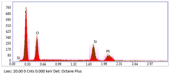 Figure 4 shows the EDX results obtained from the FESEM images. Based on the FESEM micrograph, a few points were selected to determine the composition of the Gr-MRE. Carbon exhibits the highest proportion, followed by platinum, silicon, and oxygen (34.35, 29.71, 20.64, and 15.31%, respectively). The weights and atomic percentages are tabulated in Table 2. Sengupta et al. [21] mentioned that Gr particles are made of two-dimensional lattice bonds, the most stable form of carbon under standard conditions; this explained the status of carbon as the largest constituent in the EDX results. Platinum was used in the coating process conducted before the FESEM observation of the Gr-MRE sample; this was to prevent the charging of the sample surface with electrons, which causes glare images. Since SR was used as the matrix for Gr-MRE fabrication, silicon could also be distinguished.