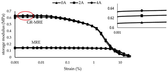 Storage modulus of MRE and Gr-MRE at different strain amplitude at different magnetic fields of 0, 2, and 4 A.