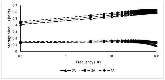 In this test, the strain is set at 0.01% based on the linear viscoelastic region during the strain sweep test. The frequency varied from 0 to 100 Hz at 0, 2, and 4 A. Figure 7 and Figure 8 show the storage and loss moduli of the Gr-MRE and conventional MRE samples.
