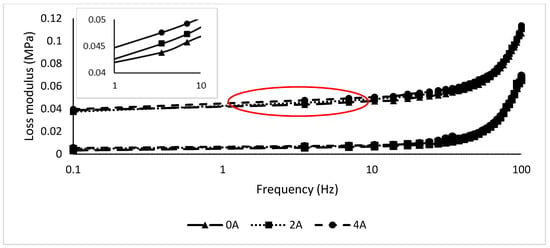 As shown in Figure 7, the storage modulus of all Gr-MRE exhibited an increasing trend with the growth of frequency and decreased when approaching 60 Hz. In comparison to the conventional MRE samples, the Gr-MRE shows higher initial and maximum storage moduli. This trend can be related to the existence of Gr in the MRE samples. This is also believed to be due to the two-dimensional structures of Gr and the good mixing of GR in MRE. Meanwhile, the loss moduli of all samples in Figure 8 along with the inset show an insignificant effect toward the frequency regardless of the addition of Gr in the MRE and appear to have elevated logarithmically starting from 10 to 100 Hz. This resulted depicts that, at high frequency, more energy dissipated from the sample.