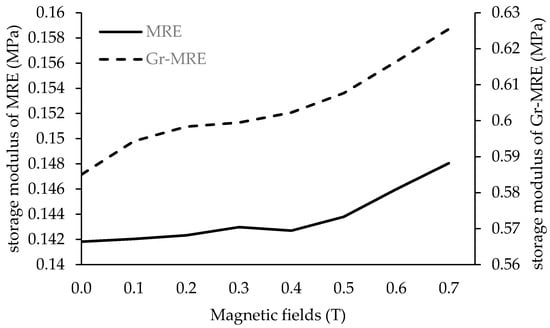 (1) The storage modulus of Gr-MRE was increased by the effective interfacial interaction between the filler and matrix, where a stronger interaction resulted in a higher storage modulus of the Gr-MRE in comparison with the conventional MRE [30].