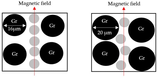 Further factors that possibly influence the MR effect are the matrix, the magnetic particle, the graphite properties, and the curing methods. Therefore, in order to identify the effect of each component, a set of experimental works was carried out. Similar to previous work [15], the results showed that the MR effect had slightly different values (2.6%). Figure 10 shows the concentration of Gr used in the MRE fabrication. The MR effect of the current/previous work might be lower because the increased graphite content contributed to a higher initial storage modulus [15], and this leads to a higher stiffness. Another possibility is that the RTV silicone rubber matrix provides more room for CIP particles to vibrate and thus introduces a sample that is more elastic [26]. This would increase the MR effect and provide suitable curing conditions that randomly distributed the composite particles throughout the matrix. Although the detail of the previous curing condition has not been comprehensively described, it is well known that curing conditions have some differences, especially in terms of the particle alignment caused by the magnetic field applied during the curing process. Such composite (anisotropic) exhibits different physicochemical behavior such as higher MR efficiency [27]. Nevertheless, the investigation of each component is beyond the scope of this paper but could be investigated further in the future.