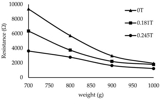 Meanwhile, the effect of the magnetic field on the resistance value is interesting to discuss. Figure 13 shows the reduction in resistance for specific applied weights, under magnetic fields from 0 to 0.245 T. It is evident that decreased as the magnetic field strength increased. The observed behavior and pattern is similar to that observed in the study by Li et al. [18]. It is apparent that the Gr particles introduced conductivity in the MRE; thus, the output was detected as the change in resistance. While the increase in the Gr weight fraction increases the conductivity, it reduces the resistivity when the material is subjected to an external applied force.