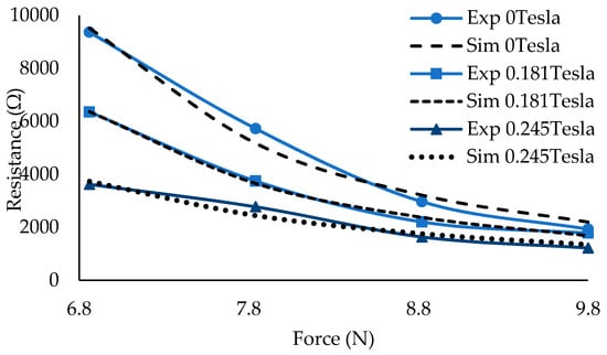 The relationship between the resistance value and the applied force can be analyzed and characterized using an empirical model. The relationship between the applied forces or mass and in the proposed work and other works that deal with the smart materials affected by resistance and magnetic fields, such as that by Li et al. [18], is similar to the decay phenomena described by the Arrhenius equation [29]. The decrease in as a function of the weight or force () can be described using Equation (2), where is a material constant, and is another constant that replaces the activation energy in the Arrhenius equation. Figure 12 shows an example wherein the model is fitted to the experimental results for two magnitudes of the magnetic field, the off-state condition (0 T), and 0.181 T. The figure shows a reasonable agreement between the simulation and experimental results. More comprehensive observations and accuracies are described in Table 4. The and values are decreased with the increase in magnetic fields because, in general, the resistance values are also decreased with the increase in the applied magnetic fields. Hence, the root mean square errors (RMSEs) also tend to be lower at higher magnetic field intensities. Meanwhile, the correlation between the resistance and force can be observed when R2 changes. In general, the correlations are acceptable, with values being over 0.9500. Based on Equation (2) and previous discussions, and values can be assumed to have dependency on the initial stiffness of the material. A higher magnetic field means that the material will become stiffer. Consequently, the thickness difference before and after more weight of the material is added at higher magnetic fields is less than that at a lower magnetic field. In other words, stiffer material means that becomes higher, as shown in Table 4. If the model is applicable to a wider range of the applied force, the resistance value is expected to be nearly constant. One of the reasons can be that the maximum allowable compression has been reached, but this phenomena need to be further validated.