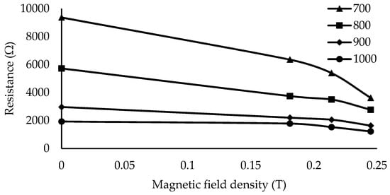 Figure 11 shows the magnitude of the resistance () versus the applied weight for various magnetic fields. The experiment was conducted by placing weights of 100–1000 g at increments of 100 g, with the magnetic field varying from 0 to 0.245 T, but the reading was only detectable at 700–1000 g. The magnitudes of were recorded. decreased exponentially as the weight changed from 700 to 1000 g. Under the magnetic field, under all applied forces and conditions, the magnitude of showed a decreasing trend. displayed a decreasing trend as the weight varied from 700 to 1000 g: 9367–1929 Ω, 6353–1782 Ω, 5393–1528 Ω, and 3623–1221 Ω at 0, 0.181, 0.214, and 0.245 T, respectively. The decreasing trend of with increasing weight explains the field-induced particle motion. When the magnetic field increases, it would increase the particle magnetization and the attractive forces between the particles. These particles tend to form a chain structure resulting in the increment in conductivity and reduction in . The results are consistent with the observations of Li et al. [18]; in this work, the authors state that the rate of decrease of . is higher than 60% when the applied force is increased. At 0, 0.181, 0.214, and 0.245 A, the reductions in were observed to be approximately 79, 72, 71, and 66%, respectively. This phenomenon demonstrates that, when the magnetic field intensity increases, reduces. This phenomenon might be because under various magnetic fields, the CIP content was affected by particle mobility, thereby affecting the movement of Gr particles. Moreover, MRE also exhibits piezoresistivity. When an MRE sample is compressed, its conductivity increases because of two factors: the increment of the conductive area induced by the deformation of the MRE and the reduction in the thickness of the polymer membrane between two adjacent particles [28]. As widely known, the R value has a proportional relationship with the length of a cable or, in this work, the thickness of the sample and an inversely proportional relationship with the conductive area of the sample. The same phenomena and conclusion have also been shown by Tian et al. [28].