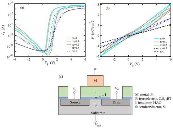 The polarization, P, of the CxS1–xBT FeFETs was also measured as a function of Vg, as shown in Figure 1b. During the P–Vg measurements, Vd, Vs, and Vsub were set to 0 V. Note that the Vg was applied across all the stacked layers, which included CxS1–xBT, HAO, and the interfacial layer between HAO and Si, and the surface potential of the silicon. While Vg changed between −4 V and 6 V, half the peak-to-peak amplitudes of polarization (Phppa) [21,30], were 2.56 μC/cm2 (x = 0), 2.22 μC/cm2 (x = 0.1), 2.12 μC/cm2 (x = 0.2), 1.46 μC/cm2 (x = 0.5), and 0.93 μC/cm2 (x = 1). The MWs on P–Vg curves, i.e., the voltage differences when P = 0, were 0.72 V (x = 0), 1.18 V (x = 0.1), 0.86 V (x = 0.2), 0.56 V (x = 0.5), and 0.1 V (x = 1). Drawing directions of the P–Vg hysteresis loops for all cases were counter-clockwise. As a non-volatile memory FeFET cell, a large coercive field of the CxS1–xBT is preferred rather than a spontaneous or remnant polarization if an appropriate Phppa (typically 2.5 μC/cm2) is attained [30].