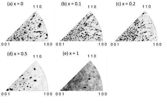 The EBSD scanning results are shown in Figure 2 and Figure 3. Figure 2a–e are inverse pole figure maps, where every point of the CxS1–xBT was shaded with a color guided by the color code unit triangle according to its orientation (Figure 2f). In the map (Figure 2), the different colors represent the different orientations. The red color point designated as (001) means that the c-axis of the grain is parallel to the film normal. The green color point designated as (100) means that the a-axis of the grain is parallel to the film normal. When the points with the same crystal orientation are accumulated together and make an area of one color, this is a grain of CxS1–xBT observed by EBSD. A neutron diffraction showed that SBT and CBT have spontaneous polarization along the a-axis [31]. Electrical measurements of polarization versus electric field (P–E) curves of epitaxial SBT thin films supported the a-axis directed spontaneous polarization [32,33]. Hence the direction of spontaneous polarization of CxS1–xBT can be regarded as the a-axis, and the more green color in the EBSD map (Figure 2f) can be attributed to larger polarization. Figure 3 indicates the unit triangles of inverse pole figures, in which one black point represents one unique orientation of the CxS1–xBT.