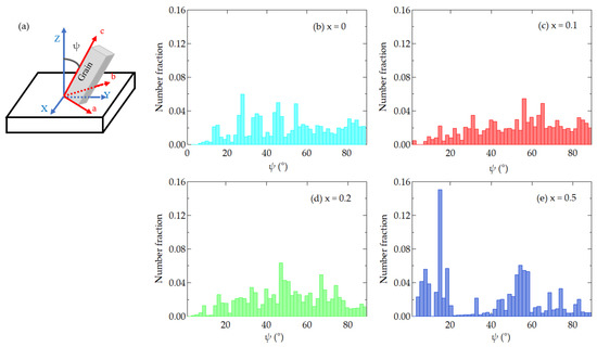 (a) Definition of angle ψ, and EDSD analyses of crystal orientation distribution represented as a function of ψ of the CxS1–xBT layers in the FeFETs with (b) x = 0; (c) x = 0.1; (d) x = 0.2; and (e) x = 0.5. In each Figure of (b–e), integration of number fraction as a function of ψ makes 1.0.