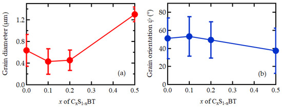 Average values of (a) grain sizes and (b) crystal orientations of CxS1–xBT with x = 0, 0.1, 0.2, and 0.5. Error bar lengths are twice the standard deviations.