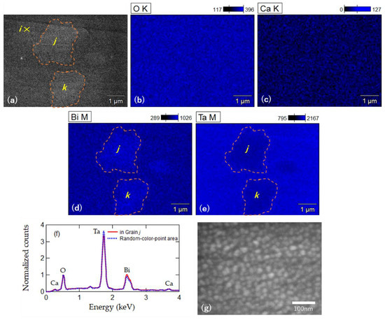 In Figure 2, there were noisy areas composed of dots with multiple colors. Such noisy areas existed only near the grain boundaries in the CxS1–xBT maps of x = 0, 0.1, and 0.2, but appeared more in the maps of x = 0.5. In the case of CBT, more than half the area was noisy. As an experimental fact, no Kikuchi bands appeared on these noisy multi-color-dot areas during the EBSD scanning. In order to consider the origin of the noises, we made an energy dispersive X-ray spectroscopy (EDX) characterization for the CBT as shown in Figure 2e. EDX (Noran System 7, Thermo Scientific) was equipped with the same FESEM as the EBSD was. The observed area was the same as the area used for the EBSD characterization. Figure 6a–e show the EDX mapping results. Figure 6a is the gray-colored intensity map of the integrated counts. Figure 6b–e are the separated maps of the elements, O, Ca, Bi, and Ta. The surrounded areas j and k shown in Figure 6a,d,e are positioned at the same grains j and k in Figure 2e by the EBSD. Maps for Bi and Ta had shades of colors with the same shapes of the grains j and k (Figure 6d,e), whereas those for O and Ca had no features with uniform colors (Figure 6b,c). According to the EDX maps for the Bi and Ta (Figure 6d,e), the noisy multi-color-dot area outside j and k included less Bi and more Ta than the area inside j and k. The EDX spectra of the local two spots, inside j and outside j and k, were investigated using ten-times as large a magnification as that used in Figure 6a–e. As shown in Figure 6f, the spot outside j and k exhibited lower Bi and higher Ta intensity peaks than the spot inside j, while both spots had exactly overlapped Ca peaks. A magnified SEM image at the position i in Figure 6a indicated that the spot outside j and k, which was in the multi-color-dot area in Figure 2e, consisted of tiny grains as small as 20 nm (Figure 6g). By these experimental results, there are possible two explanations for the multi-color-dot areas. The first explanation is that grains in the areas were crystalized with random orientations, but they were as small as the resolution limit of EBSD. Hence Kikuchi bands could not be observed. The second one is that grains were not well crystalized yet. From the latter view point, a possible phase was Bi-substituted CaTa2O6 on the multi-color-dot area, whose crystallization temperature was much higher than the present annealing temperature of about 800 °C [34,35]. Further investigation in the future will provide a sure solution.