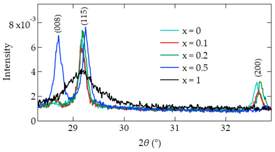 The XRD spectra of CxS1–xBT are shown in the Figure 7. Samples of Pt/CSBT/HAO/Si with non-patterned Si were used [19]. The SBT and CxS1–xBT with x = 0.1 and 0.2 have narrow and strong non-c-axis peaks of (115) and (200). They do not have the c-axis oriented (008) peak. On the other hand, C0.5S0.5BT shows the (008) c-axis peak as well as the (115) peak but does not have the (200) peak. The XRD measurements of the c-axis orientation more in the C0.5S0.5BT than in the CxS1–xBT with x = 0, 0.1, and 0.2 are in good agreement with the EBSD characterization, which showed the C0.5S0.5BT orientated near the c-axis direction (Figure 4e). The XRD of the CBT seemed insufficiently crystalized because the (115) peak got weaker and broader than those of SBT and CxS1–xBT of x = 0.1 and 0.2, and the (008) and (200) peaks did not appear. The insufficient crystallization of the CBT was supported by EBSD observation of a major area occupied by multi-color dots (Figure 2e).