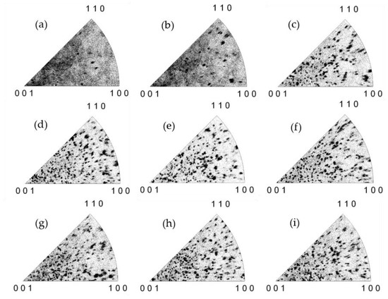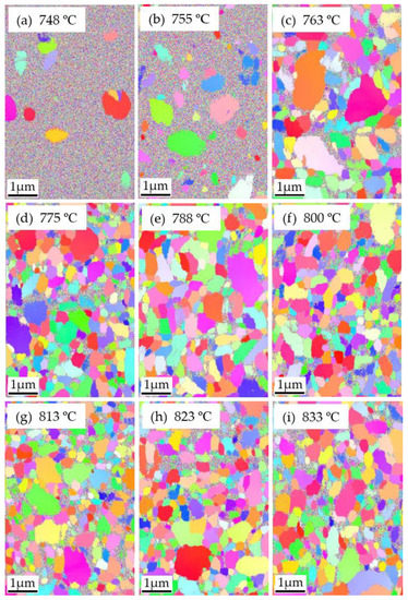 EBSD inverse pole figure of CxS1–xBT FeFETs with different annealing temperature, (a) 748 °C, (b) 755 °C, (c) 763 °C, (d) 775 °C, (e) 788 °C, (f) 800 °C, (g) 813 °C, (h) 823 °C, and (i) 833 °C.