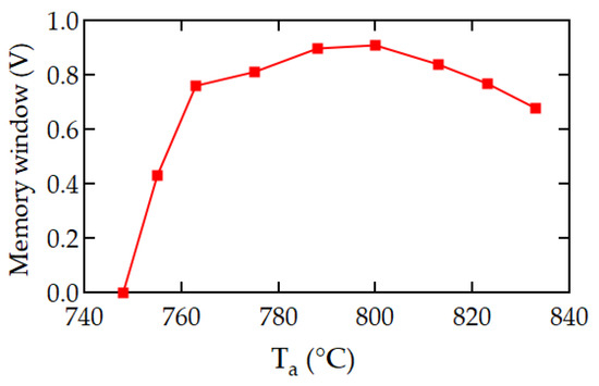 The inverse polar figures (Figure 9a–i) showed a similar tendency without significant differences from Figure 8a–i. The memory windows of these FeFETs that were reported [19] are shown in the Figure 10 as a function of Ta. The MW of the C0.1S0.9BT FeFET with Ta = 748 °C was 0 V. The MW with Ta = 755 °C was 0.43 V. With further increases of Ta from 763 °C to 813 °C, the MW became as large as 0.8 V–0.9 V. More exactly, at Ta = 788 °C and 800 °C the MWs exhibited the maximum. After exceeding the maximum region, the MWs were gradually decreased. MW = 0.68 V was obtained at Ta = 833 °C.