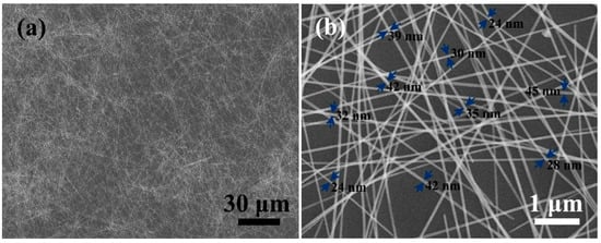 Figure 2 demonstrates the morphology of the as-synthesized AgNWs by FE-SEM. It was observed that a typical wire-like structure was obtained by solvothermal method, as shown in Figure 2a. The great mass of wire lengths was measured to be about 120 ± 15 μm using DigitalMicrograph and ImageJ software (Keyang International Trade (Shanghai) Co., Ltd., Shanghai, China). A closer examination revealed no other silver nanostructures, such as nanoparticles, nanorod, and nanocube, which indicates as-synthesized AgNWs had high purity and uniformity. The detailed and typical magnified morphology are presented in Figure 2b. It was observed that a smooth surface was formed on AgNWs. The diameter of AgNWs ranged from 24 nm up to 45 nm, and the average diameter was about 40 nm, which illustrates a high aspect ratio of ~2500. It is well known that thin and long AgNWs will greatly influence the photoelectric properties of AgNW-based TCFs [29].