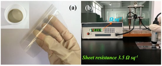 To explore potential applications, as-synthesized AgNWs was used as a conductive material to prepare conductive ink using HEC as adhesive. The inset of Figure 6a records the appearance features of as-prepared AgNWs conductive ink. As shown in the inset of Figure 6a, the conductive ink exhibited typical atrovirens, indicating a small diameter of AgNWs. It is widely accepted that the color of AgNWs darkens with decreasing diameter of AgNWs. In addition, the addition of HEC can effectively enhance the viscosity of ink, and give it excellent printability. The flexible nature of as-fabricated AgNW-based TCFs was verified. The TCF was curved by hand, as shown in Figure 6a, indicating a good flexibility for our conductive film. On closer inspection, we found that the surface of PET is highly uniform. The latex gloves behind the conductive film could be seen clearly, illustrating the film was highly transparent (the transmittance is shown in Figure 7). Because electrical conductivity is a remarkable parameter to authenticate an excellent film, the sheet resistance of as-fabricated AgNW-based TCFs was tested by four-point probe, as shown in Figure 6b. Of importance, our result illustrates an ultra-low sheet resistance of ~3.5 Ω sq−1, which was much less than previous reports [38,39,40,41]. To verify the adhesion of the as-fabricated AgNW-based TCFs, an adhesion test was performed by a kapton tape, and the adhesion was estimated to be 0/5B (ISO/ASTM grade).
