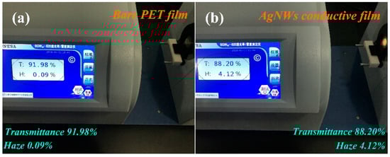 Afterwards, the optical property of as-fabricated AgNW-based TCFs was elucidated, as shown in Figure 7. In contrast, the optical property of bare PET substrate was tested by transmittance and haze analyzer. Figure 7a displays transmittance and haze of bare PET substrate were 91.98% and 0.09%, respectively. Figure 7b represents the optical property of as-fabricated AgNW-based TCFs, and transmittance and haze were 88.20% and 4.12%, respectively. Summing up the above results, the AgNWs can be used for conductive material, and the as-synthesized AgNW-based TCFs exhibited excellent photoelectric properties.