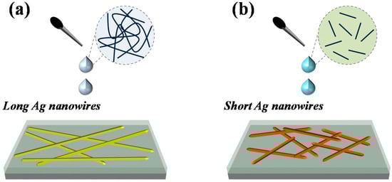 The mechanism for the ultra-low sheet resistance was caused by ultra-long and high aspect ratio AgNWs, as schematically represented in Figure 8. In Figure 8a, we can find that long AgNWs with small diameter can form a more effective network with smaller nanowire number density by providing longer percolation paths and reducing the number of high-resistance nanowire–nanowire contacts in the film [22], thus causing low sheet resistance. However, for short AgNWs, the nanowire number of the unit area is greater than for long AgNWs. Simultaneously, the junction number between nanowire and nanowire unit area also increases, as shown in Figure 8b. The loose connection of the AgNWs at the junction leads to a higher sheet resistance. Therefore, the optoelectrical properties of AgNWs networks depend heavily on nanowire length and diameter [42,43,44].