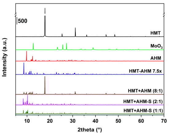 Initially, before the synthesis, all of the precursors were characterized by several analytical methods. As seen from Figure 2, X-ray patterns of the precursor structures differ. In the sample HMT+AHM-M (8:1) produced by mechanical mixing of HMT and AHM, the presence of diffraction lines appropriated to AHM and HMT was observed. However, the line corresponding to the formation of the HMT-AHM complex was also present in the sample.