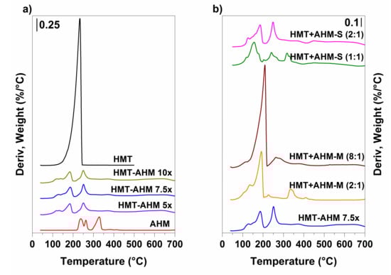 The influence of the HMT excess on the HMT-AHM complex prepared by the Afanasiev method was investigated by varying the molar ratio of HMT:AHM in the sequence of 15:1 (sample HMT-AHM 7.5×), 10:1, and 20:1 (samples HMT-AHM 5× and 10×). The TGA results (Figure 3) show that the forming complexes were absolutely identical. Their similarity was confirmed by the same decomposition in terms of mass depletion of the final residues and decomposition rates at the corresponding temperatures.
