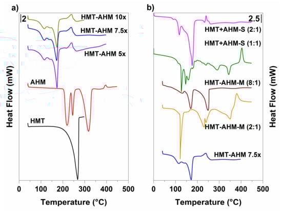 DSC results displayed in Figure 4 show that the HMT-AHM complexes prepared with different HMT excesses (HMT-AHM 5×, 7.5× and 10×), as in TGA, had identical profiles. In comparison with the samples HMT+AHM-M (2:1) and HMT+AHM-M (8:1), some differences to the HMT-AHM complex in the DSC signals were recorded.